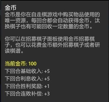 回合收入:回合基礎收入+利息收入+連勝獎勵/連敗補償 組成了你每回合能夠獲得的金幣。利息收入即你結束回合時的金幣的10%。利息收入最高為5,所以當你的金幣囤積超過50后,盡量把這些富余的金幣轉化為你的棋子。