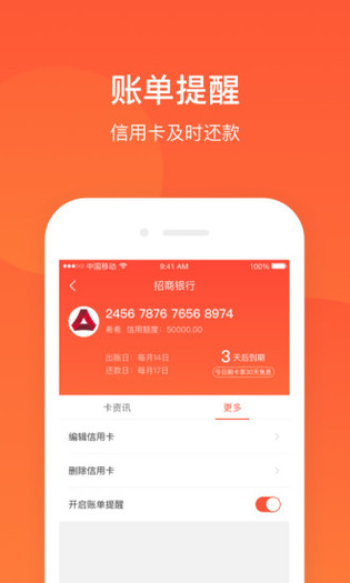 備卡是一款高效、簡(jiǎn)便、實(shí)用、安全的賬單管理APP工具。在線添加管理信用卡,實(shí)現(xiàn)賬單實(shí)時(shí)管理,到期及時(shí)提醒,便捷管理。