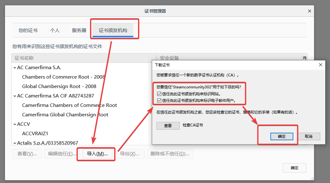 導(dǎo)入時(shí)選擇證書文件”steamcommunityCA.pem”