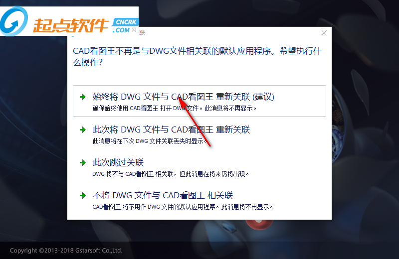 1、啟動(dòng)軟件,提示你將cad看圖王與dwg等格式的圖紙關(guān)聯(lián),選擇你需要關(guān)聯(lián)的方式
