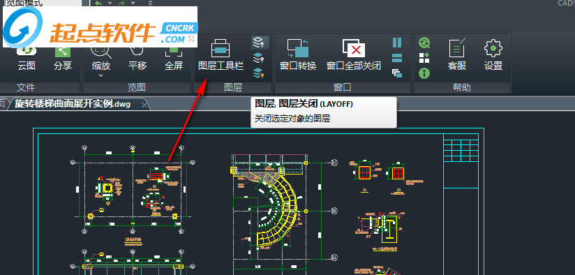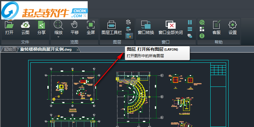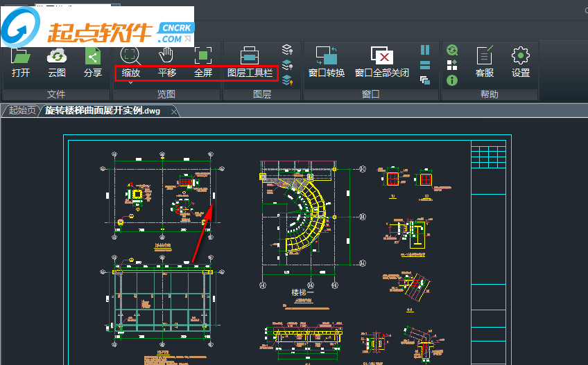 3、如圖所示,點(diǎn)擊打開(kāi),進(jìn)入圖紙查看界面,可以選擇打開(kāi)dwg圖紙,小編打開(kāi)“旋轉(zhuǎn)樓梯曲面展開(kāi)實(shí)例.dwg”