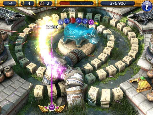 畫面:埃及祖瑪2的游戲畫面在一代的基礎(chǔ)上有了很大的提升,精美的背景采用埃及的風(fēng)景,利用富有地形感的圖形和路線突出顯示了魔球移動(dòng)的3D效果,這種平面背景的3D化給了游戲奇妙的視覺(jué)感受。