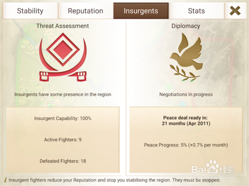 1、屏幕右下角的Reputation相當(dāng)于你的血量,降到0就輸了,叛軍的活動、腐敗太高、事件選項、外國頻繁駐軍等因素都會導(dǎo)致它下降,但增加的方式卻極其有限,目前看來主要就三種方式增加,一是每穩(wěn)定一個地區(qū)會增加幾點,二是一些升級選項能夠讓Reputation立刻增加,比如banker(手機大媽)就有一個升級項能夠立刻增加7點,三是一些事件選項,比如在和叛軍談判過程中采取強硬立場,逮捕貪污犯等能夠增加Reputation,總之提高的方式極為有限,游戲過程中請控制好你的Reputation2、與叛軍和談目前看來是一個很快速的通關(guān)方式,一旦和談成功會換來好幾年的和平期,足夠你去穩(wěn)定所有地區(qū),但要注意的是即便你在和談過程中再怎么采取強硬立場,最終如果你接受和談條件都會大幅降低你的Reputation(可能會高達(dá)20多點),所以請預(yù)留好你的Reputation。