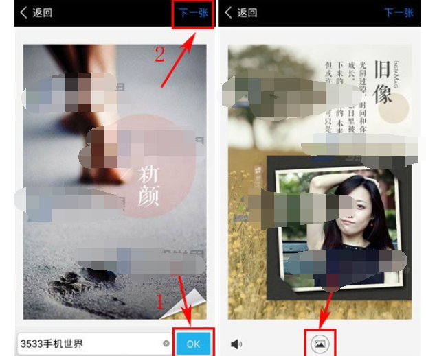3)點(diǎn)擊下方的文字可以編輯相冊(cè)的【名稱】,編輯好后點(diǎn)【OK】的按鈕,接著點(diǎn)擊右上角的【下一張】,跳轉(zhuǎn)至第二張后,點(diǎn)擊下方中間的【圖片】按鈕,從相冊(cè)中選擇一張圖片。(如下圖)