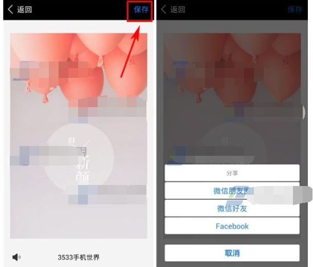 5)每一張都是這么添加圖片的哦,翻到最后一頁的時(shí)候,右上角的下一張按鈕會(huì)變成【保存】,點(diǎn)擊保存后,還可以分享到微信、FaceBook哦。(如下圖)