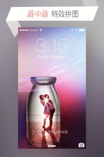 【創(chuàng)意模板】獨(dú)創(chuàng)的畫中畫特效、3D特效,讓你的照片脫穎而出、與眾不同,看起來超神奇!【鎖屏模板】用你自己的照片,做手機(jī)鎖屏界面 -- 點(diǎn)亮手機(jī)的一瞬間,看到你最美的一張自拍!