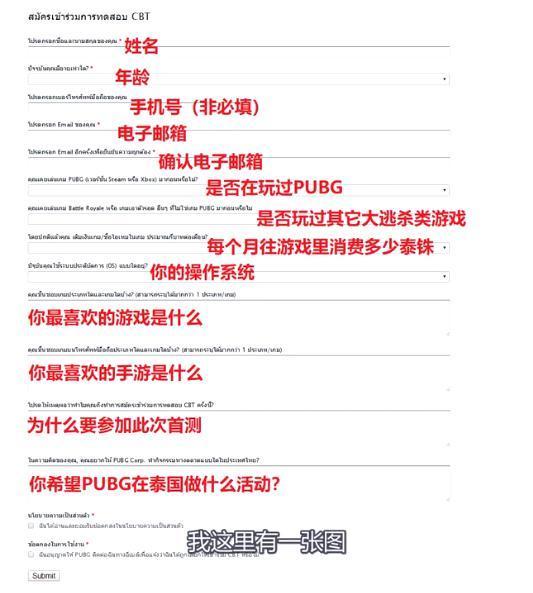 在點(diǎn)擊圖一屎黃色的申請按鈕以后,就會出現(xiàn)下圖的申請頁面了。大家可以根據(jù)漢字標(biāo)注的內(nèi)容,一一填寫,在必要的時候可以使用百度翻譯,比如有一項(xiàng)問題是:“為什么要參加此次首測”,我們可以填寫:“我的電腦不足以運(yùn)行PUBG”,在填寫之前記得把漢字翻譯為泰文就可以了。