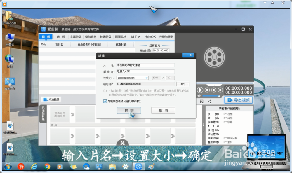 此時會彈出討厭的廣告(點擊關(guān)閉),再為視頻取個片名→設置視頻大小→確定。