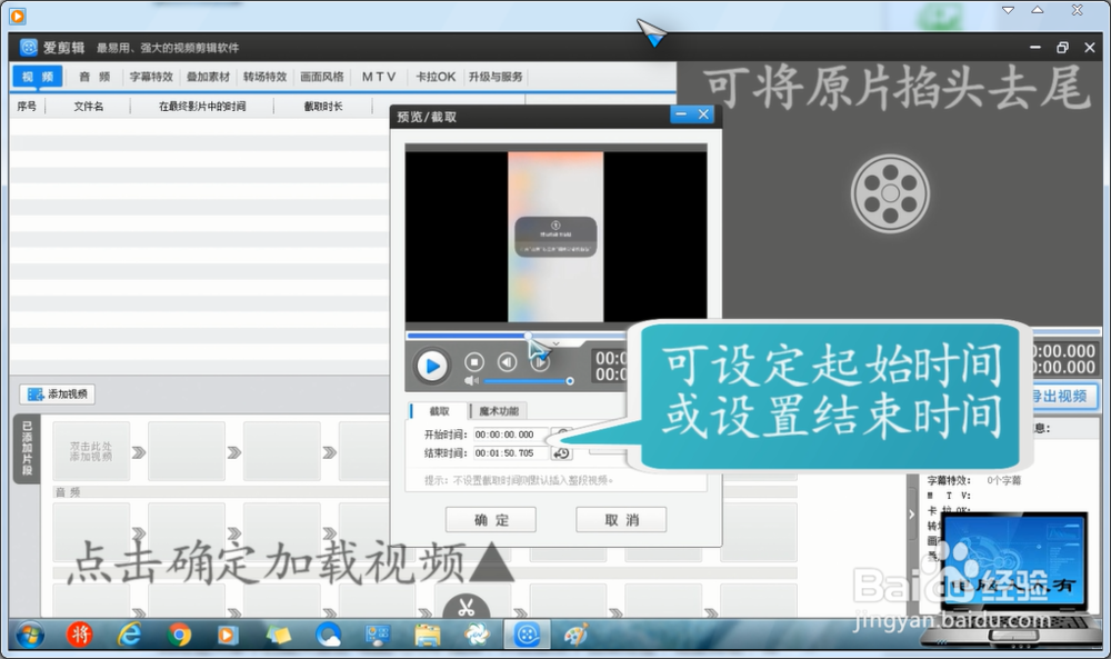 如果錄制的視頻需要掐頭去尾的,可以在這里直接設定起始時間、結(jié)束時間→確定加載視頻。