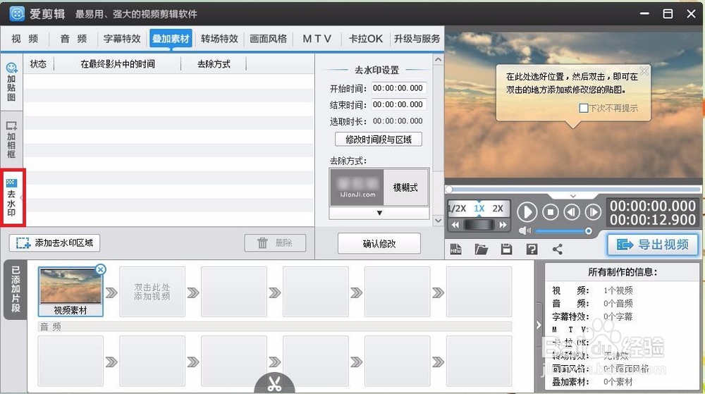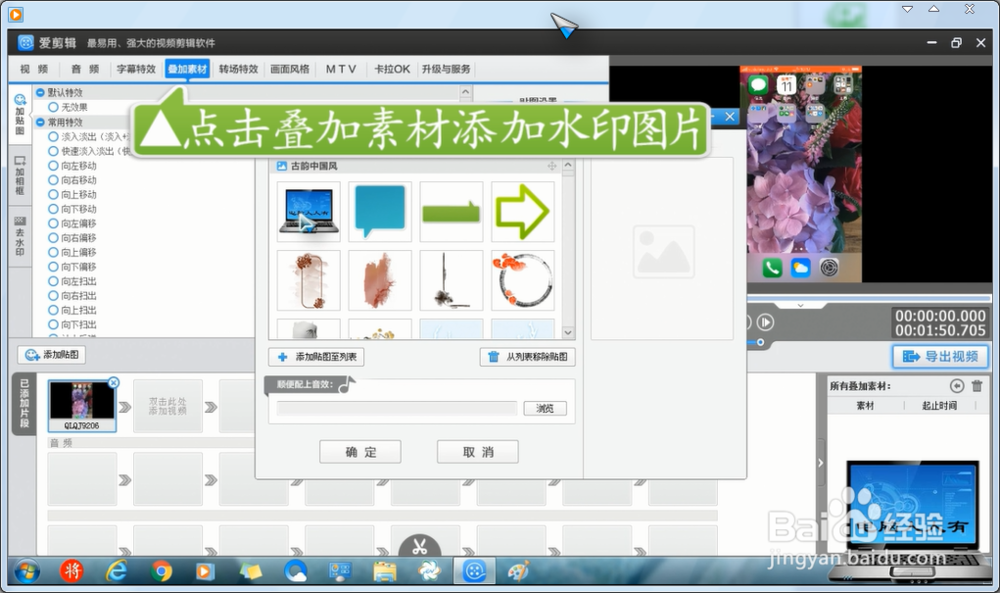 點擊疊加素材→可以添加圖片水印,固定的圖片,自定義上傳的圖片等素材(可以縮放、轉(zhuǎn)向、復制、剪切、粘貼等操作)→勿忘設置時間(默認只顯示1秒)。