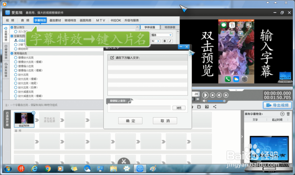 選擇好特效后,雙擊視頻,添加文字,還可為配的文字添加音效,如圖所示