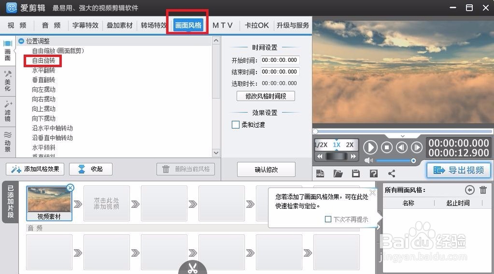 選擇好想要添加的特效后,點擊“添加風格效果”按鈕,可以選擇“為當前片段添加風格”或“指定時間段添加風格”,添加成功后,可在“效果設置”中設置角度,設置成功后,選擇確認修改,如圖所示