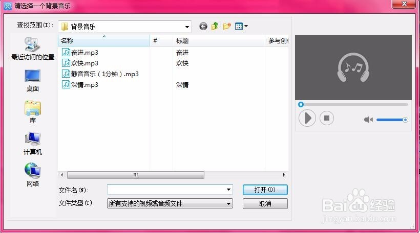 選擇添加“音效”或“背景音樂”,會彈出素材窗口,根據(jù)需求選擇自己需要的素材,也可下載素材添加,如圖所示