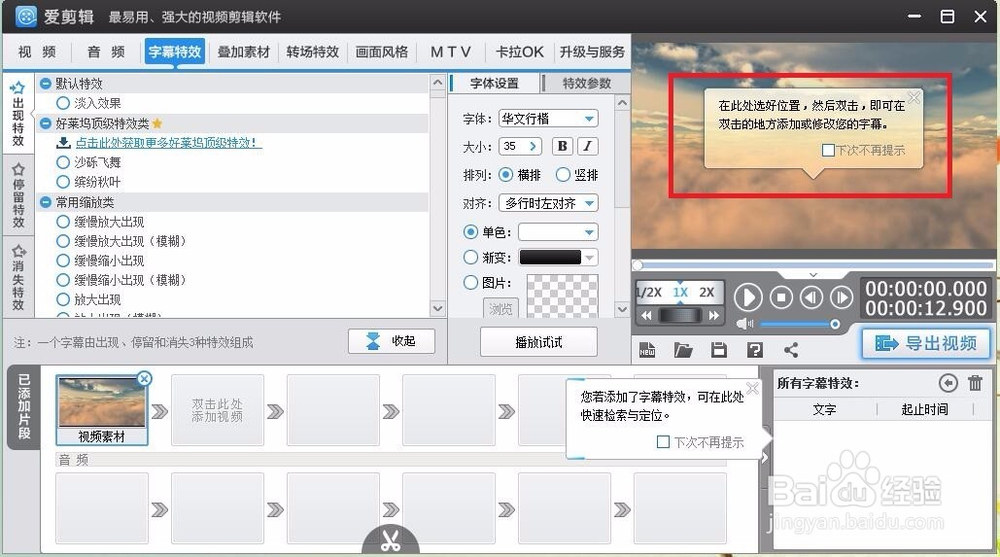 字幕特效→雙擊編輯框打開字幕編輯框→輸入文字→定義方位(可以翻轉(zhuǎn)等操作)→也可以加載特效→設置顏色和時間(默認6秒→進入2秒、停留2秒、退出2秒)。