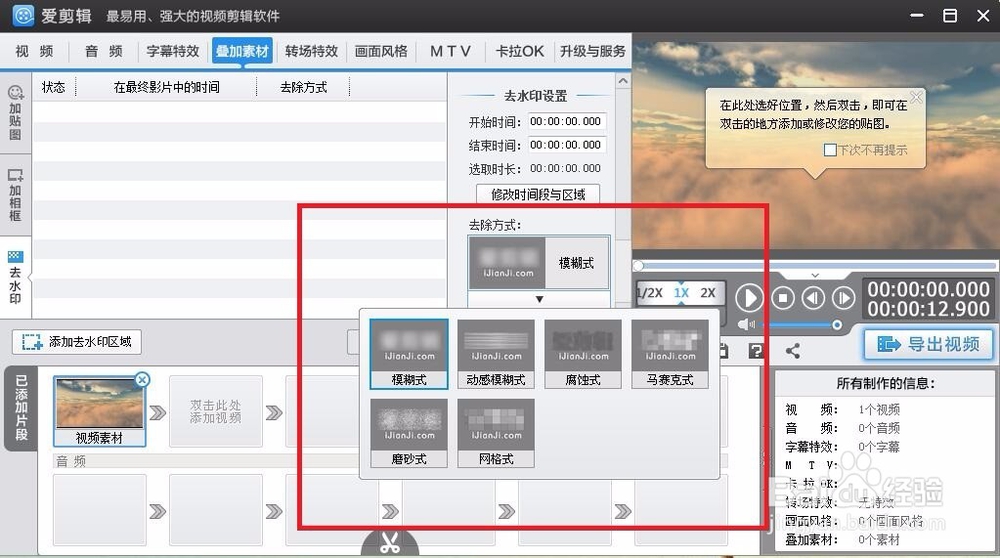 在疊加素材中,有一項“去水印”功能,此項功能可為視頻添加馬賽克,進入“去水印”功能頁面,在頁面中間“去水印設置”中選擇“去除方式”,如圖所示
