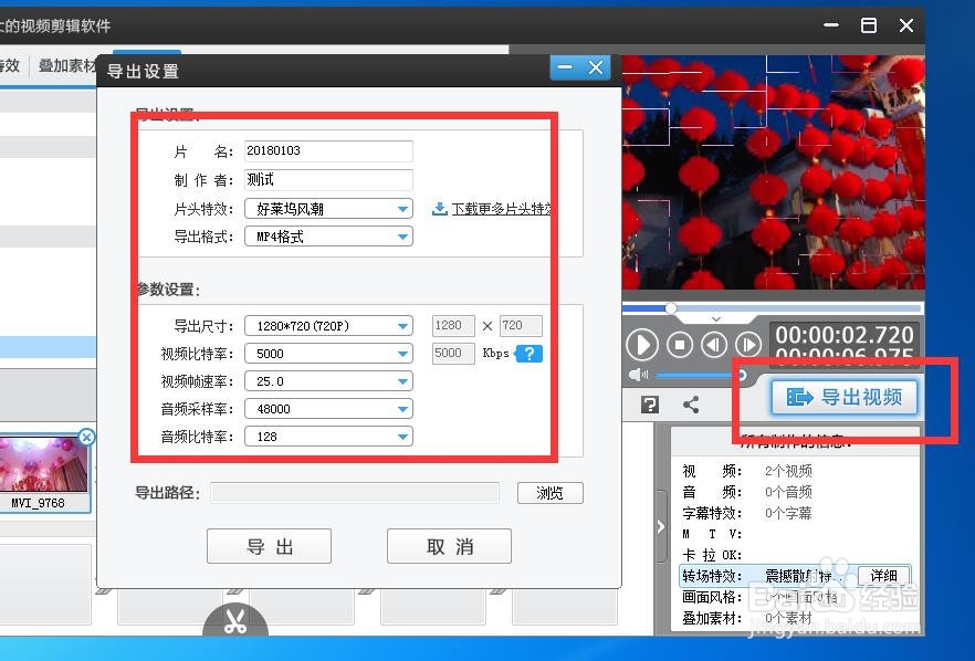 所有特效設置完畢后,選擇界面右側(cè)“導出視頻”功能,可對視頻基本資料及參數(shù)再次進行修改,如圖所示