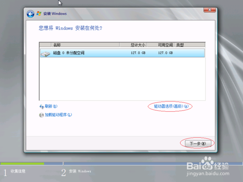 6、安裝操作系統(tǒng)之前硬盤必須分區(qū),如圖點擊驅(qū)動器選項(高級)建立磁盤分區(qū)。