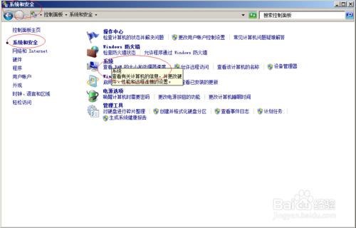 3、喚出"控制面板"程序窗口,如圖所示。點擊"系統(tǒng)和安全"圖標,用于查看并更改系統(tǒng)和安全狀態(tài)。