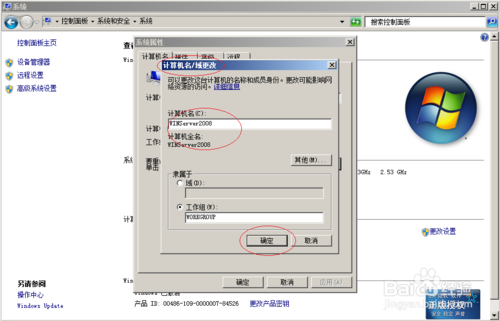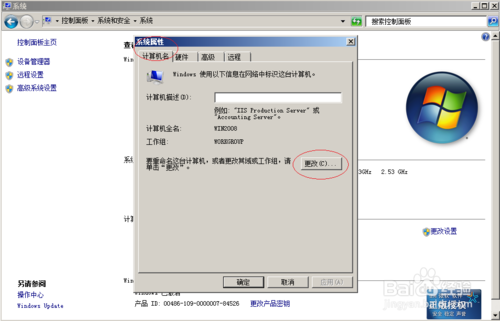 6、如圖所示,彈出"系統(tǒng)屬性"對話框。點擊"計算機名→更改"按鈕,"計算機名/域更改→計算機名"文本框輸入新計算機名。