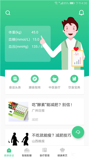 4.軟件會(huì)依據(jù)您的健康狀況為您量身定制個(gè)性化的飲食指導(dǎo),為您推薦適宜食材和食譜,介紹飲食宜忌。