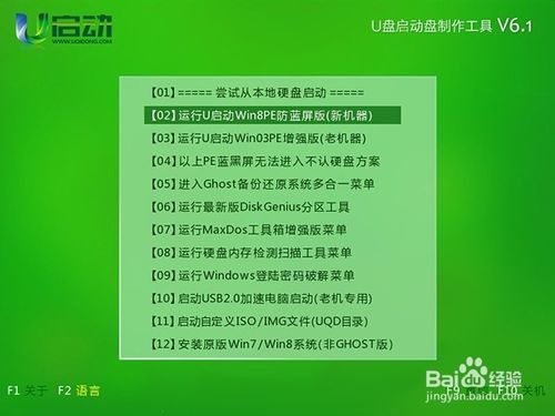 把制作好的u啟動(dòng)u盤啟動(dòng)盤插在電腦usb接口上,然后重啟電腦,在出現(xiàn)開機(jī)畫面時(shí)用一鍵u盤啟動(dòng)快捷鍵的方法進(jìn)入到啟動(dòng)項(xiàng)選擇窗口,選擇u盤啟動(dòng),進(jìn)入到u啟動(dòng)v6.1主菜單界面,選擇【02】運(yùn)行u啟動(dòng)win8pe防藍(lán)屏(新機(jī)器)選項(xiàng),按回車鍵確認(rèn)選擇,如下圖所示: