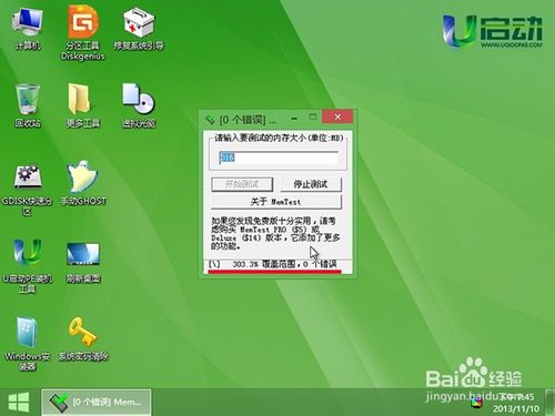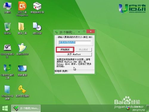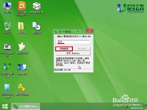進(jìn)入到u啟動(dòng)win8pe系統(tǒng)桌面后,點(diǎn)擊桌面左下角“windows圖標(biāo)——硬件檢測(cè)——物理內(nèi)存檢測(cè)工具”,如下圖所示: