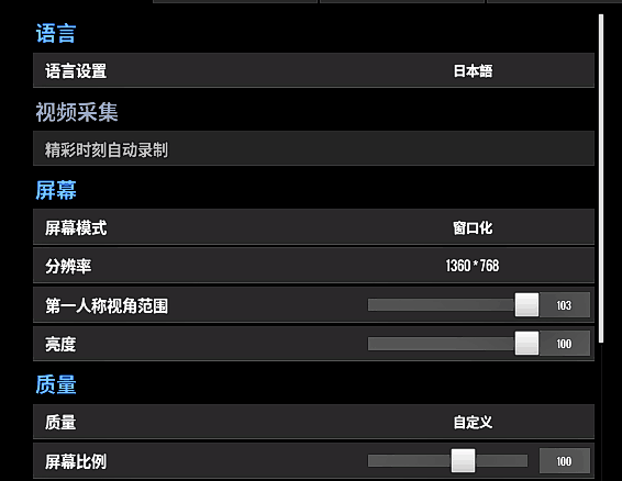 因為方便截屏所以分辨率是這樣。亮度我建議拉滿,看自己的承受能力調高吧。這個在比較暗的地方是很容易發(fā)現(xiàn)敵人的。大家可以適當?shù)脑O置。屏幕比例的話 追求流暢的同學,可以調到100就行了。 你會發(fā)現(xiàn)從拉滿到減少到100會幫你加10左右的FPS,而不會對游戲有什么影響。另外喜歡紅血的同學可以把語言改掉,我改的日文,附屬國的繁體字比較好認~