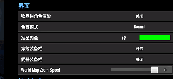 另外游戲性這里物品欄角色渲染可以關掉 這個東西并沒有什么用還會游戲你的游戲流暢程度。實測關掉后打開背包速度和FPS都會增長。然后準星顏色,因為cs等FPS游戲的影響我改了綠色,看個人喜好,綠色、紅色都比較醒目。穿戴欄這個選項建議打開,你可以隨時知道你的防具的損耗程度而不用打開個人面板去看,方便很多。