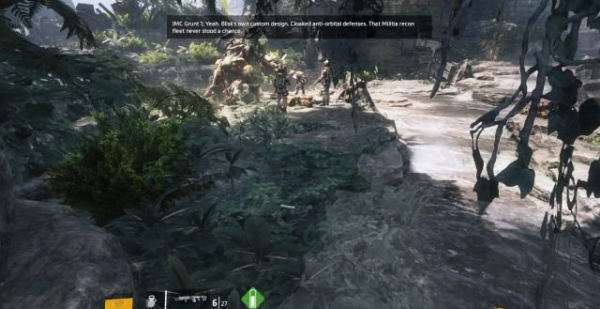 在這里千萬(wàn)不要引發(fā),否則在前方戰(zhàn)艦墜毀點(diǎn)處的大批IMC守衛(wèi)就會(huì)瘋狂地向Cooper射擊。