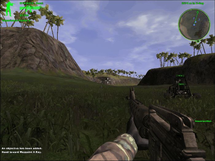 山谷村莊戰(zhàn)。點shift鍵上車,和隊友一起攻擊前進,路上把幾個摩托兵和一架直升機滅掉。到達敵村莊后,4名隊友會分別包抄左右兩邊,主角只需要配合隊友全滅村莊內敵人即可。確認沒有遺漏后,在一個木屋中發(fā)現(xiàn)一個像洗碗機一樣的東西,是GPS系統(tǒng),幾槍打爆,過關。本關難度很小,隊友幾乎包辦了一切,建議用M16,難度1星。