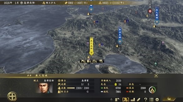 這里是從島津家所占領(lǐng)地至九州北部的畫(huà)面。九州中部的城市也可在圖中得到確認(rèn)。九州有很多大名家聚集在這里,北部的大友家·龍?jiān)焖录抑惖膹?qiáng)豪也在這里,若要對(duì)隔海相望的九州地區(qū)進(jìn)行攻略,相應(yīng)的海戰(zhàn)準(zhǔn)備是很有必要的。