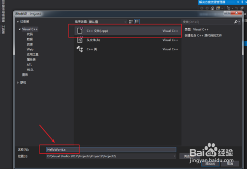 7、選擇c++文件,下面的文件名改成.c ,這樣就創(chuàng)建了一個c語言項目了
