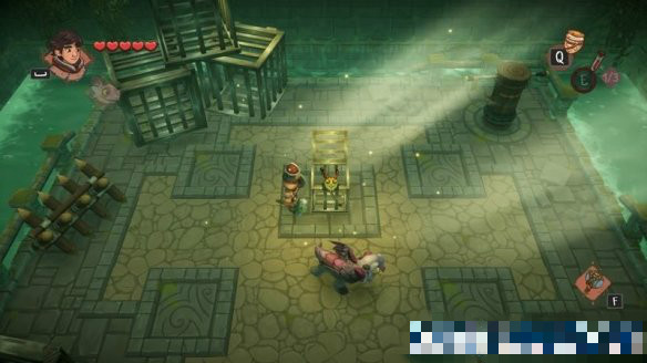 這里通過(guò)側(cè)面攻擊箱子可以讓箱子往攻擊前方位移,讓箱子壓住按鈕即可打開(kāi)右側(cè)的門(mén)。