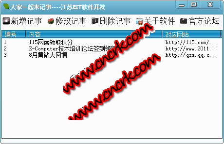 大家一起來(lái)記事 V1.0 綠色免費(fèi)版 大家一起來(lái)記事:此軟件為江蘇eit----大家一起來(lái)系列第二套軟件,此軟件為方便qq發(fā)燒友的每日活動(dòng)禮包領(lǐng)取,各大網(wǎng)站的簽到活動(dòng),游戲禮包類(lèi)的網(wǎng)站形式每日訪問(wèn)領(lǐng)取積分禮品的功能,又可以進(jìn)行日常的生活的記事之用,雙擊項(xiàng)目便可以打開(kāi)對(duì)應(yīng)的網(wǎng)站,右擊可以查看內(nèi)容和標(biāo)記完成項(xiàng)目!