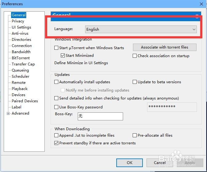 接下來在彈出來的界面中,我們會看到language設(shè)置,我們點擊它,會彈出來一個下拉框,我們選擇中文設(shè)置;參考下圖