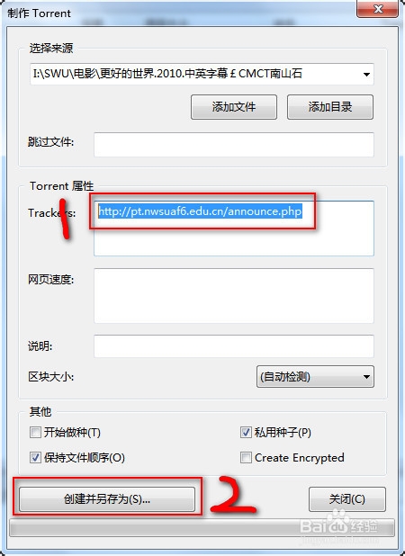 將tracker復(fù)制到utorrent的tracker屬性內(nèi)!其他信息不用管,一般默認(rèn)(具體每個PT站要求可能不一樣)。填寫好后,【點擊創(chuàng)建另存為】,保存種子存放路徑。步驟如下圖: