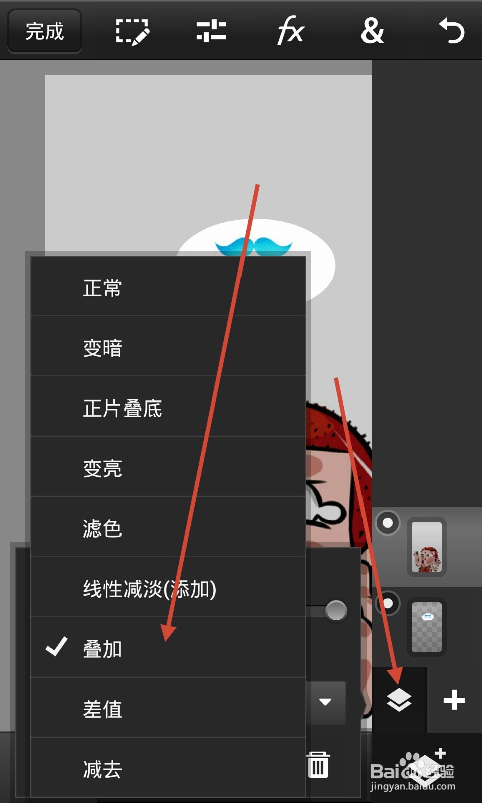 9 點(diǎn)擊右下角的勾勾,然后再點(diǎn)加號(hào)左邊的選項(xiàng),點(diǎn)擊正常選項(xiàng),換成正片疊加