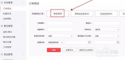 2、點(diǎn)擊的進(jìn)入如下頁面,在此窗口中待發(fā)貨里面有一個提示,可以直接點(diǎn)擊它進(jìn)行發(fā)貨流程內(nèi)。