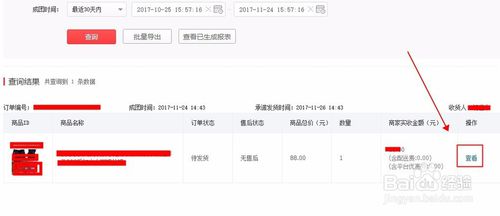 3、點(diǎn)擊后進(jìn)入如下窗口,在此窗口中可以看到需要發(fā)貨的訂單,并在此訂單最右側(cè)找到并點(diǎn)擊“查看”按鈕,進(jìn)行查看此訂單明細(xì)信息。