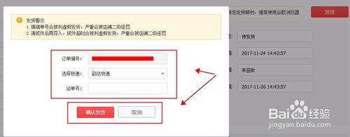 5、點(diǎn)擊“發(fā)貨”按鈕后,這時會彈出一個上傳快遞單號的小窗口,在此窗口中選擇好相應(yīng)的快遞名稱,并在下方輸入快遞單號再點(diǎn)擊下方的“確認(rèn)發(fā)貨”按鈕,進(jìn)行發(fā)貨操作。