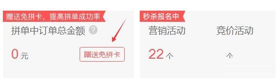 目前免拼卡設(shè)置商家可以前往拼多多商家后臺,進(jìn)入后臺首頁后,查看“拼單中訂單總金額”選項(xiàng),右下角有“贈送免拼卡”功能,如圖所示: