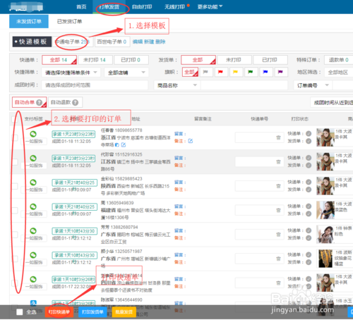 3、下面就可以進(jìn)行打印訂單了,點(diǎn)擊頭部導(dǎo)航打單發(fā)貨,選擇訂單,選擇要打印的快遞模板,