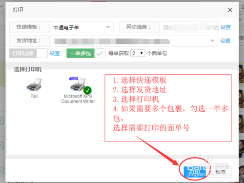 4、選擇快遞模板,選擇打印機(jī),如果需要打印多個包裹,勾選一單多包,選擇需要打印的包裹數(shù),然后點(diǎn)擊打印就可以打印出快遞單了