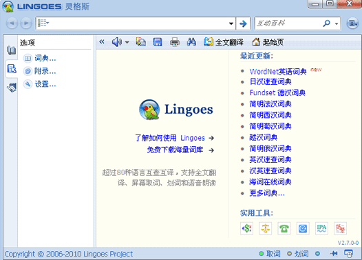 lingoes 靈格斯詞霸是一款簡明易用的翻譯與詞典軟件,支持全球超過60多個國家語言的互查互譯、支持多語種屏幕取詞、索引提示和語音朗讀功能,是新一代的詞典翻譯專家.