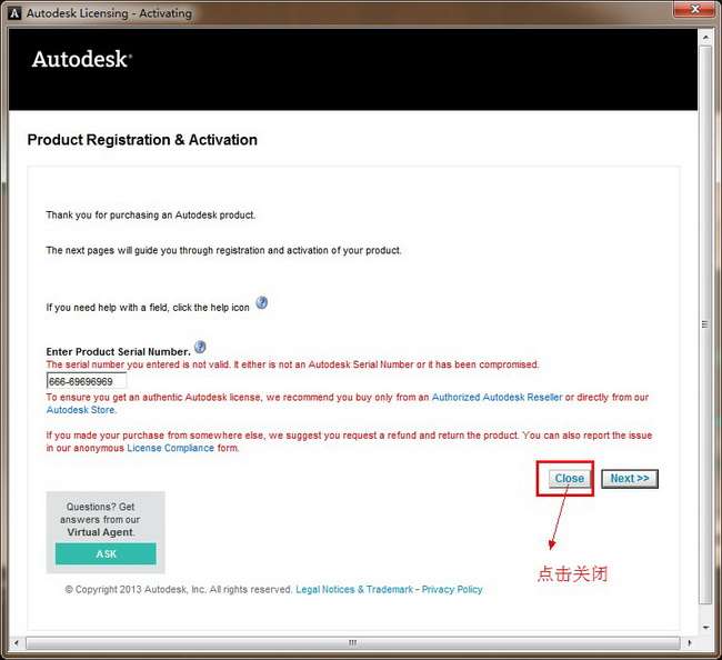 這里呢,我們發(fā)現(xiàn)并不是我們和我們之前的一樣,有輸入激活碼區(qū)。所以有兩種激活方法,一種是斷網(wǎng)激活,另外一種就是本教程要講述的:我們先點(diǎn)擊關(guān)閉,關(guān)閉這次激活,然后返回到之前的激活界面 ,再重新點(diǎn)擊激活,這時(shí)我們會發(fā)現(xiàn)自動(dòng)跳轉(zhuǎn)到輸入激活碼界面。 如圖