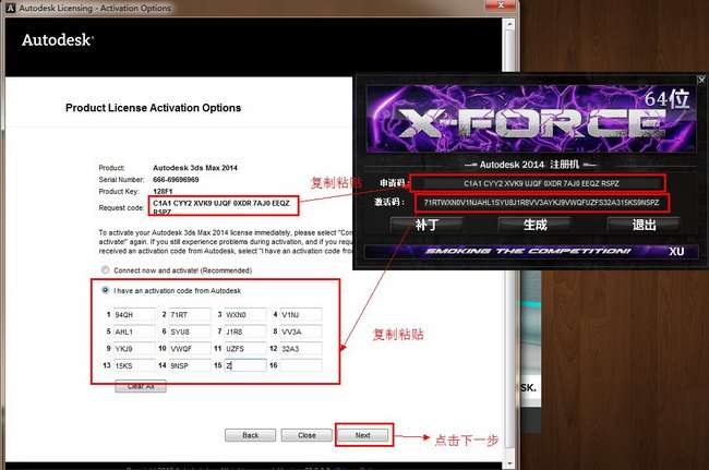 把3dmax2014 64位中文版里的申請?zhí)枏?fù)制粘貼到注冊機(jī)的申請?zhí)枡谥校缓簏c(diǎn)擊計(jì)算激活,生成激活碼后,把激活碼復(fù)制粘貼到3dmax2014 64位中文版激活欄中,最后點(diǎn)下一步 如圖