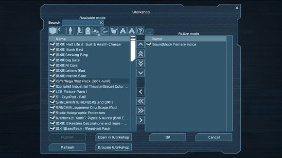算然原版游戲已經(jīng)有足夠的可玩性,但是創(chuàng)意工坊中仍然有許多有趣的MOD,在正式創(chuàng)建存檔之前您可以將訂閱的MOD添加進(jìn)存檔,左邊是您已經(jīng)訂閱的mod,雙擊即可將其添加至您的存檔世界,已經(jīng)添加的MOD會(huì)顯示在右邊,如果您不確定添加的MOD是否是您想要的,可以點(diǎn)擊“在創(chuàng)意工坊中打開”的選項(xiàng)(圖中的“Open in workshop”)進(jìn)行查看。如果您想去掉某個(gè)MOD,只要雙擊右側(cè)的MOD就可以了(注意:如果在去掉MOD之前已經(jīng)在存檔里使用MOD,則在去掉MOD之后所有預(yù)期有關(guān)的方塊都會(huì)消失或者導(dǎo)致一些BUG的發(fā)生)。