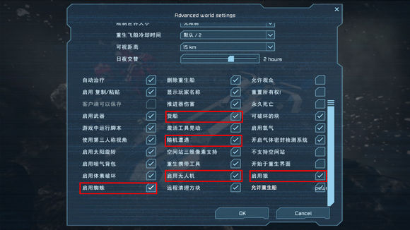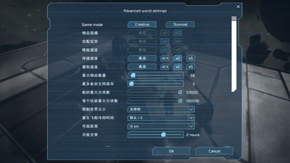 太空工程師中文版大部分時(shí)候您可能還是一個(gè)人或者只是和朋友玩耍的,所以我們著重看一下自定義世界,出了選擇不同的開局之外,您還可以選擇游戲的環(huán)境惡劣程度(隕石的傷害以及頻率大小)。