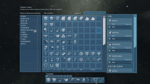 您在游戲中會(huì)經(jīng)常接觸G菜單與K菜單,當(dāng)您不在載具內(nèi)時(shí),按下“G”鍵會(huì)調(diào)出如上圖菜單,您需要將工具以及想要建造的方塊拖動(dòng)至下方快捷欄以使用。(注:游戲中有搜索功能,但是在打了漢化補(bǔ)丁之后搜索功能會(huì)失效)
