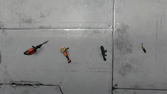 圖上從左到右分別是 鉆頭(用于挖礦和鑿洞,有探礦能力),研磨機(jī)(用于拆卸方塊),步槍,焊接搶(用于焊接方塊)。游戲中后期可以在裝配機(jī)制作效率更高的工具以及傷害量更大的步槍。